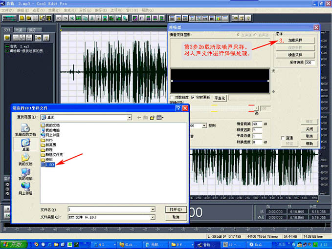 8.回到处于波形編辑界面的人声文件,打开降噪器,加载之前保存的噪声采样进行降噪处理,点确定降噪前,可先点预览试听一下降噪后的效果(如失真太大,说明降噪采样不合适,需重新采样或调整参数,有一点要说明,无论何种方式的降噪都会对原声有一定的损害)。