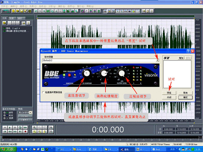 2.加载预置下拉菜单中的各种效果后(或是全手动调节三旋钮)点激励器右下方的“预览”进行反复的试听,直至调至满意的效果后,点确定对原声进行高音激励。