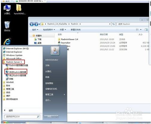 安装完毕后,我们在“开始”菜单中可以找到安装好的Radmin远程软件,然后按步骤点击图片中框中的地方“启动Radmin服务器”,这样在桌面的右下方就可以看到启动后的小图标