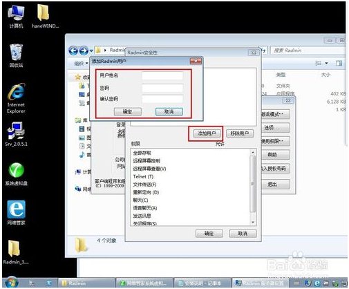 选择“Radmin安全性”,就是自己添加账户,只为Radmin使用,我觉得这个方式可以,与系统无关。当然,如果您喜欢用Windows账户来登录,也是可以的,那么请您选择“Windows NT 安全性”,进去就让你选择可以登录Radmin的Windows账户或者用户组,很方便。(我这里添加了一个Radmin用户,huweishen,待会儿用它来远程登录。)