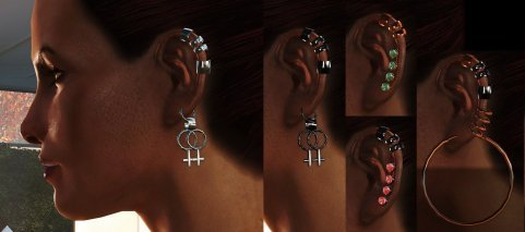化学台制造的一组耳饰,占用49号嘴部slot。一共4个样式,每个样式有3件不同材质的。+1魅力,只有女版。另:如果发型是遮耳朵的话记得换个发型,不然看不见。汉化说明:因字库缺字,“铑”写作“老金”