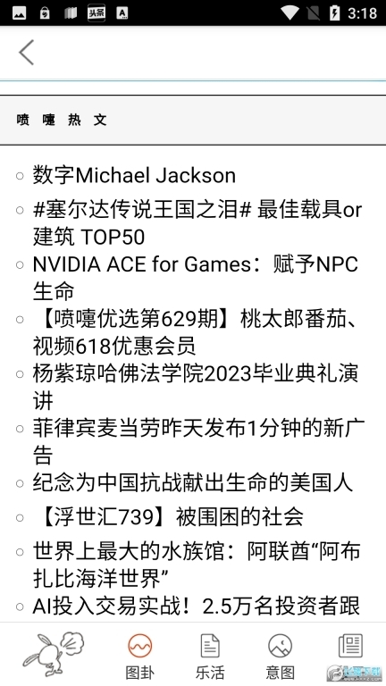 包含铂程斋、乐活、喷嚏一下、推荐阅读、热门图卦、热门喷嚏、流光、敏捷大巴、图卦、视频、热评、成长历程、浮世绘等众多板块内容。