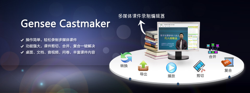 CastMaker是一款完全兼容SCORM标准课件的多媒体制作软件,可以方便的把语音、视频、文档结合录制在一起,并加上数据互动内容,录制件通过上传到北京展视互动科技有限公司在全国分布式部署的服务器上,可以生成插入代码或链接,方便的嵌入或浮出到您的网站上,也可以通过E-mail、MSN、QQ等发送到您客户或学员的手中,是一款不可多得的多媒体互动营销软件。