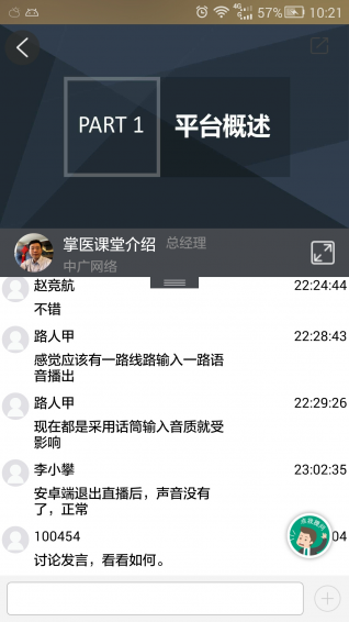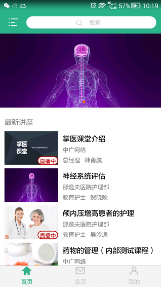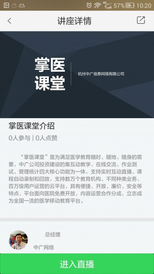 掌医课堂app是为满足医学教育随时、随地、随身的需要,杭州中广公司投资建设的集互动教学、在线交流、作业测试、管理统计四大核心功能为一体,支持实时互动直播、课程自动录制和回放,支持数万个教育机构、不同种类业务、百万级用户运营的云平台。掌医课堂app主要提供互动教学、在线交流两大核心功能,具体包括:互动教学的实时讲解、互动答疑、自主学习功能;在线交流模块的好友通讯录及文字、语音片段、图片类型的交流。