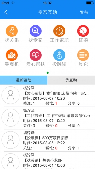 宗亲互助:发布者发起求助,其他宗亲可提供帮助,发起者可通过答谢与提供帮助的宗亲互动。发起者可关闭求助。