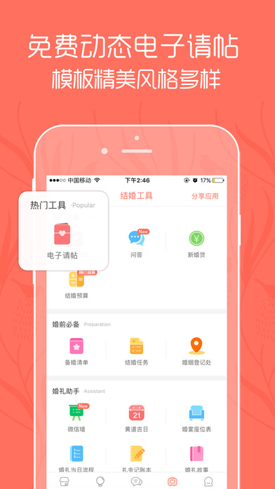 - 实用:免费提供8大结婚工具,想邀请亲朋好友就用电子请帖,想知道备婚流程就用结婚任务,想了解黄道吉日就用结婚吉日,更多工具等你来体验。