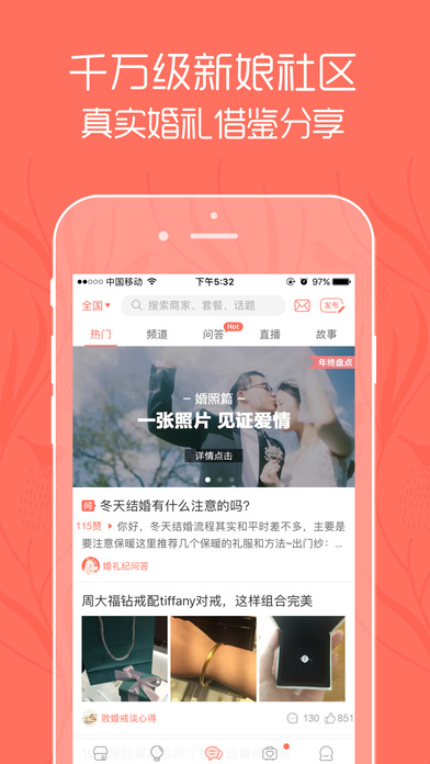 - 有趣:和百万新娘一起交流备婚经验,说说备婚心得、晒晒婚品美图。