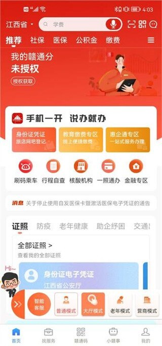 1. 点击进入赣服通平台,在热门服务内容里滑动页面,找到“养老认证”。
