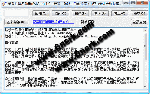 一款专门用来查询和管理扩展名数据的工具,采取数据库存储,允许自主操作数据(添加、修改、删除、清空、导入、导出等),人人都可以来编辑和扩展数据库,更可支持百科知识扩展阅读