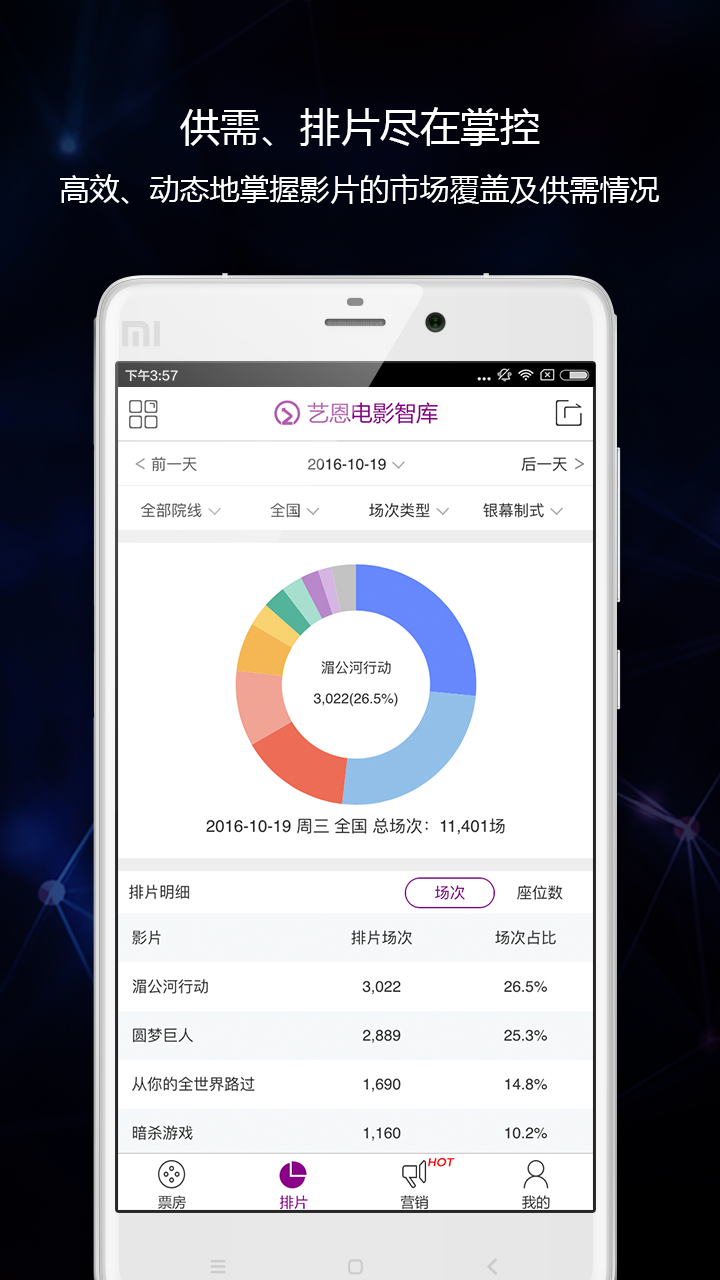 1、实时票房:国内最权威的实时票房查询工具,涵盖影片、影院、院线、影投公司、地域的票房分析,随时掌握精准、及时、全面的电影市场数据。覆盖1-5线330+城市,6000+影院。2、实时排片:高效、动态地掌握影片的市场覆盖及供需情况,实时提供院线、影院排片统计分析。