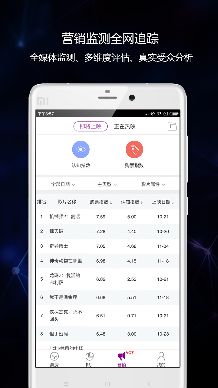 5、大数据营销监测:电影项目全网大数据营销监测服务,以科学可靠的数据反映真实的电影营销。提供电影营销行为的全媒体监测、电影营销效果的多维度评估、电影真实受众的多角度画像。