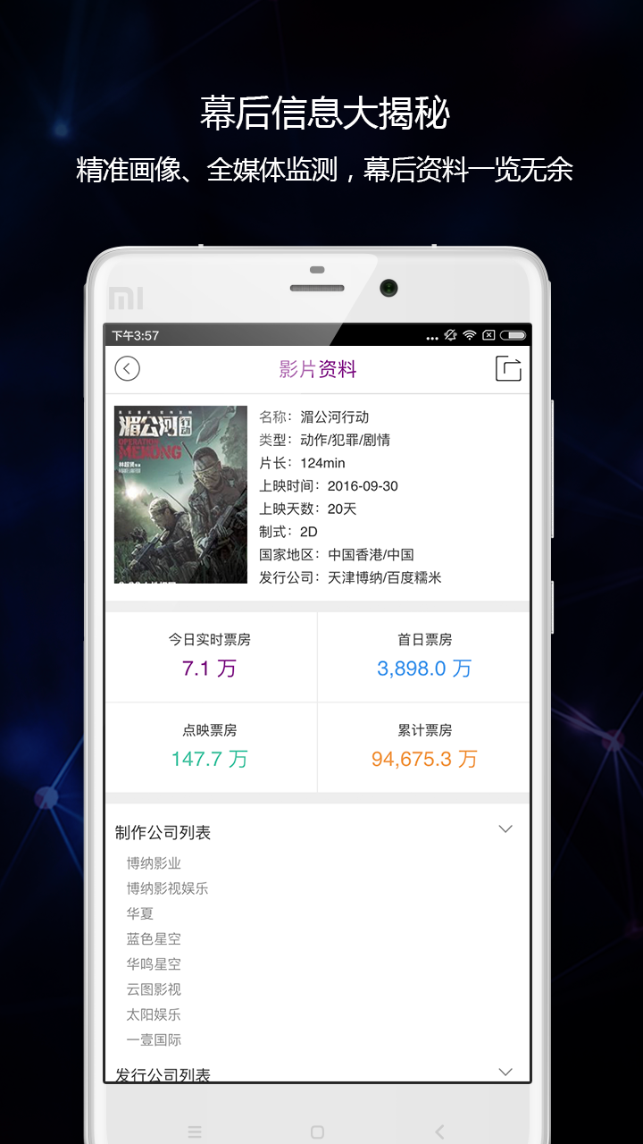 3、实时情报:电影投资及发行情报、影院情报,提前追踪项目动态、掌握电影制作规模、档期、植入广告及各地域院线、影院信息。
