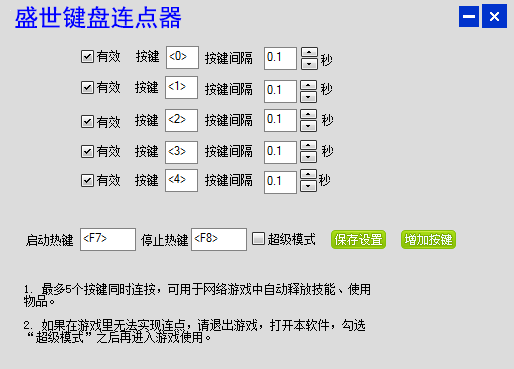 盛世键盘连点器是一款免费绿色的键盘连点工具。该工具可以突破所有反外挂系统,进行模拟键盘连续点击,可支持许多热门的游戏以及系统。有需要的朋友可千万不要错过。