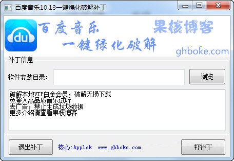 此补丁是吾爱破解论坛的大神果核打造的,功能强大值得信赖,而且支持一键打补丁去补丁,如果您发现补丁与您的百度音乐版本出现兼容性问题,也可以轻松还原。需要去播放器广告和下载高品质音乐的朋友,快来下载这款果核百度音乐VIP破解补丁吧。