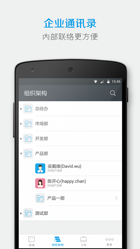 1、企业通讯录,内部联络更方便。2、即时会话,团队协作更高效。