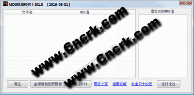 可以批量校验MD5的工具,直接拖放到列表就可以,右键点击一行可删除此行,右面框可粘贴上带有MD5值的文本,格式不限,点击“”进行比对“”可批量比对MD5值。