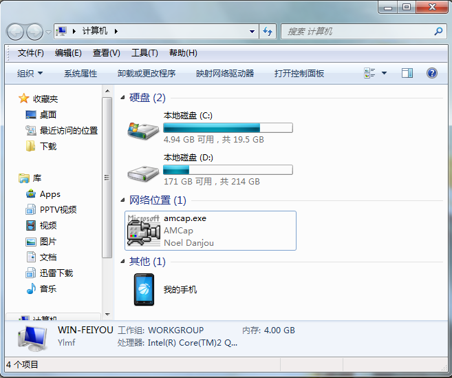 把amcap.exe文件复制到路径C:\Users\Administrator\AppData\Roaming\Microsoft\Windows\Network Shortcuts中。可以直接复制路径,把“(Administrator)”改成你的用户名,然后粘贴到我的电脑上面的地址栏就能直接打开该路径了。(如果一步步打开的话,“Users”的文件夹名称可能会是“用户”的,选择的时候要注意。)把amcap.exe复制到Network Shortcuts 之后,打开“计算机”你就会看见里面多了个amcap.exe应用程序了。双击就能打开使用。