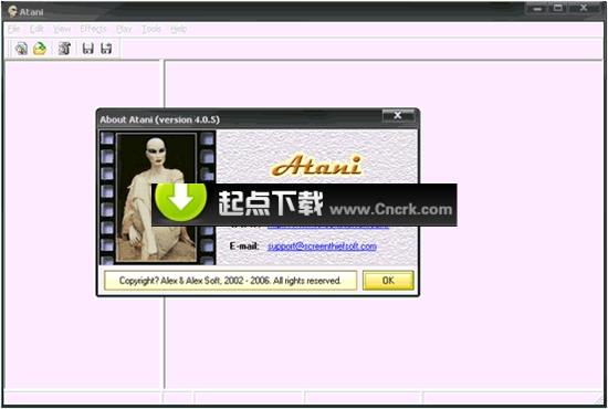 ATani V4.3.2 化绿色特别版 动画GIF制作软件,制作动画只需五个步骤。你可以使用BMP、GIF、JPG、ICO、PNG文件作为动画帧。完成后可保存为GIF或AVI文件.由于绿色版无法完成注册`所以4.3.1提供安装版!