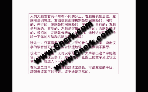 左右脑挑战 V1.0 简体中文绿色免费版 训练大脑反应速度的软件,保持良好的注意力,是大脑进行感知、记忆、思维等认识活动的基本条件。在我们的学习过程中,注意力是打开我们心灵的门户,而且是唯一的门户。门开得越大,我们学到的东西就越多。而一旦注意力涣散了或无法集中,心灵的门户就关闭了,一切有用的知识信息都无法进入