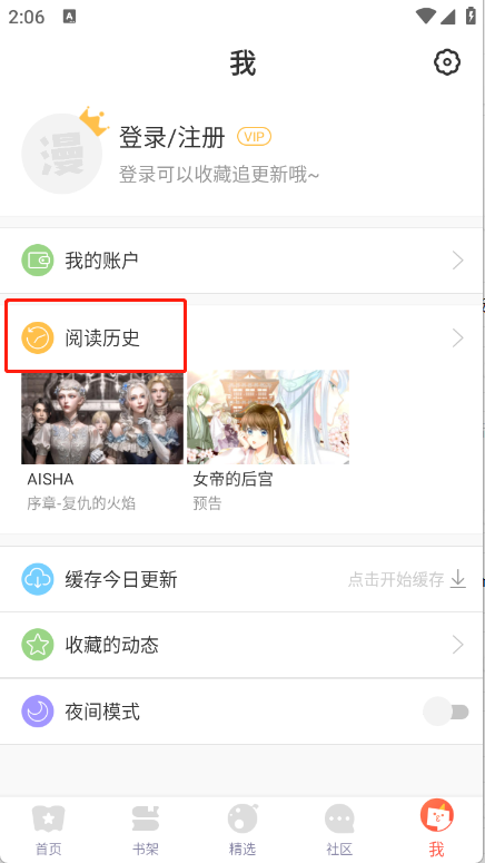 1、于我的页面上点击“阅读历史”。