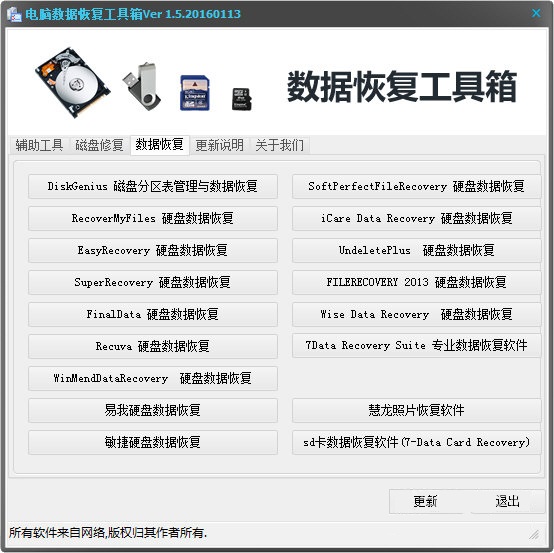 电脑数据恢复工具箱是一款实用强大的数据恢复工具。该工具箱里拥有大量的数据恢复软件,可支持电脑、手机、iPad、usb、sd卡以及内存卡数据的恢复,功能十分强大哦。+