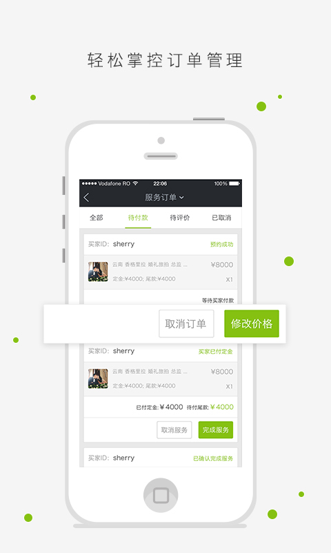 产品/服务订单状态清晰分类,方便快捷更新价格,确定服务订单档期
