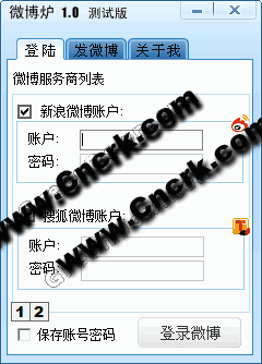 微博炉 V1.0 测试版 简体中文绿色免费版 随着微博在国内广泛流行,每个网民都拥有多个账号,管理起来颇为困难。特开发了这个小工具,可以一键将你的微博同时更新到多个账号中。方便大家更好得利用微博即时更新的特性,方便日常生活!由于时间关系,本版本只支持腾讯、新浪、搜狐三个微博网站,若有其他需求,请转告作者。本软件无限制传播,但不能用于商业用途。微博炉意味一个炉子可以同时给多个锅烧菜。^_^ 使用方法:登录完后。输入内容,点击发送即可发发送到腾讯微博、新浪微博、以及搜狐微博