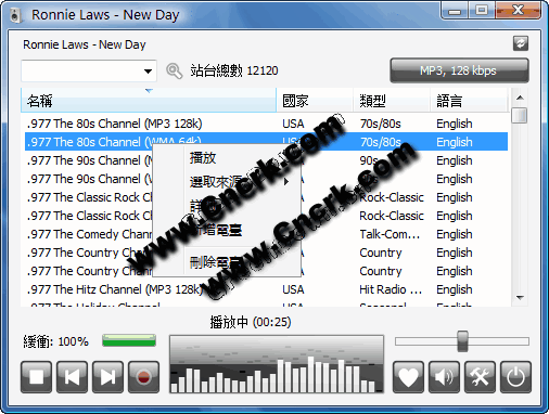 RadioSure是一款综合了全世界各地广播电台的播放器,现今的广播电台除了发送无线广播信号之外,也对网络开辟了信号借口,RadioSure内置了全世界范围内的上万个电台网络地址,按国家、电台类型、语言进行了分类,同时也内置了搜索框,方便用户查找合适的电台。