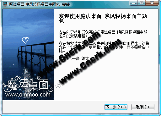 晚风轻扬电脑桌面主题 简体中文官方安装版 魔法桌面原创xp、vista、windows7通用版晚风轻扬桌面主题,主题用夜色下海边一截栈桥的画面做背景,蓝色的天空、蓝色的海水,营造出一片静谧的空间,一颗手绘的心形像是月亮般静静地悬挂在栈桥指向的天际上,只有海面上倒影的波纹让人仿佛感觉到了那一丝轻扬的晚风