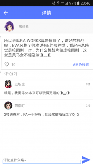 口可口可是一款基于二次元身份的分享交流社区,在这里,可以选择自己喜欢的动漫人物,并以此角色的身份在社区内分享、交流二次元方面的任何内容。喜欢二次元的你絕對(ぜったい)要尝试一下\(^o^)/【更新日志】