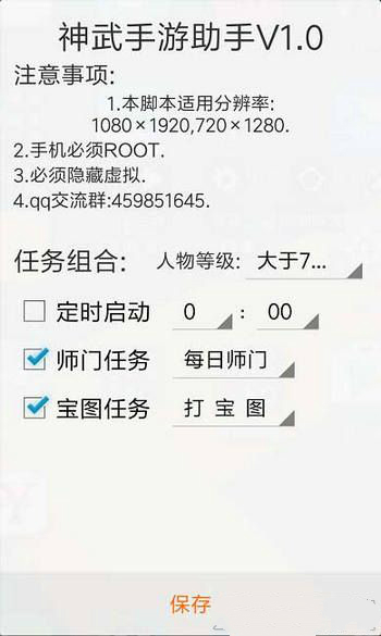 自动师门、自动宝图、自动识别拼图、科举答题、自动挖宝、环境寻宝、修炼宝箱竞技场、英雄试炼、历练任务、混队捉鬼、捉宠卖店、验证报警、分辨率验证【使用方法】
