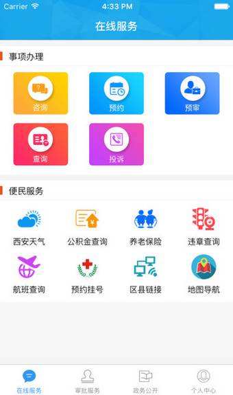 这个APP功能非常强大,包括在线服务、审批服务、政务公开、个人中心四大板块,囊括了政务中心入驻的35个部门的全部咨询、预约内容,以及大部分业务的预审工作。在线服务板块包含“事项办理”和“便民服务”两大类。如果您有什么事需要咨询、您想到政务中心办事需要预约、您的办事材料准备得差不多了需要预审、您正在办理事项的查询,或者您还对什么事或什么人不满意需要投诉,都可以通过“事项办理”板块来完成。在“便民服务”板块,你可以随时查看西安天气,查询公积金、养老保险、车辆违章、航班等,还能实现一些医院的预约挂号,通过链接浏览西安市各区县网站,如果您想查询西安地图,了解公交、驾车、步行、骑行路线,都能在这个板块实现。