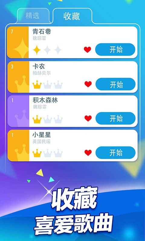 游戏采用了主角等级提升来解锁歌曲的方式,我们通过不断的弹奏曲子来获得分数与经验,当等级提升的时候,也会相应的解锁更多更强大的歌曲,挑战后面的歌曲也会获得更多的奖励。游戏为玩家们提供了丰富的歌曲库,让玩家们能在优美动听的音乐中不断的锻炼自己的操作水平和反应能力。