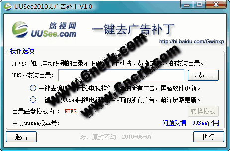 补丁程序已内置了转换NTFS格式的批处理,按转换格式将会弹出批处理提示你是否要把UUSee网络电视所在目录磁盘转换成NTFS格式,按任意键就会自动转换了,转换成功重新打开补丁程序即可去广告了。(注意:只是转换格式,不是格式化盘,转换格式不会对磁盘文件有影响!)