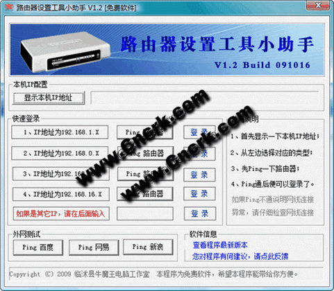 在日常电脑维护工作中,经常需要对路由器进行设置,虽然不是什么难事,但反复查看IP地址及登录查看,非常繁琐。为了简化操作,专门写了这么个小程序,一可以显示本机的IP,初步判断IP是否正确?二可以Ping路由器试一下网线连接情况,三可以快速打开路由器登录界面,不用输入IP了,四是设置完毕后可以Ping下外网测试是否已经连接到互联网。所有这些操作,只用鼠标点点就可以实现了,不用再用键盘输入来输入去的了,节省时间,同时,也利于远程指导不会设置路由器的人调试路由器