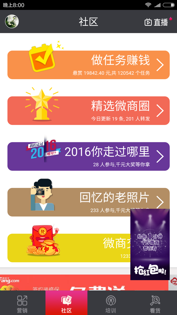 2、社区实时更新有优质的活动内容,可以发布任务,可以完成任务获取佣金。