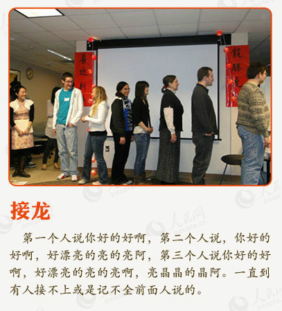 第一个人说你好的好啊,第二个人说,你好的好啊,好漂亮的亮的亮阿,第三个人说你好的好啊,好漂亮的亮的亮啊,亮晶晶的晶阿。一直到有人接不上或是记不全前面人说的。