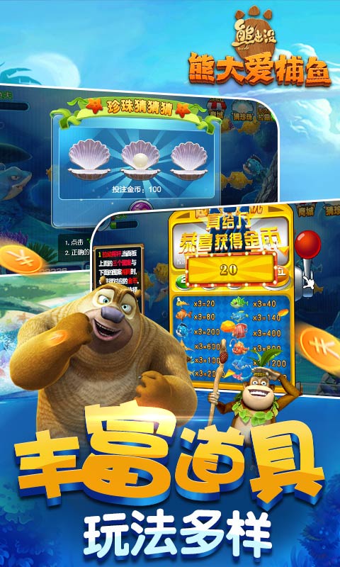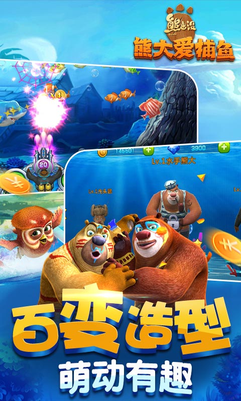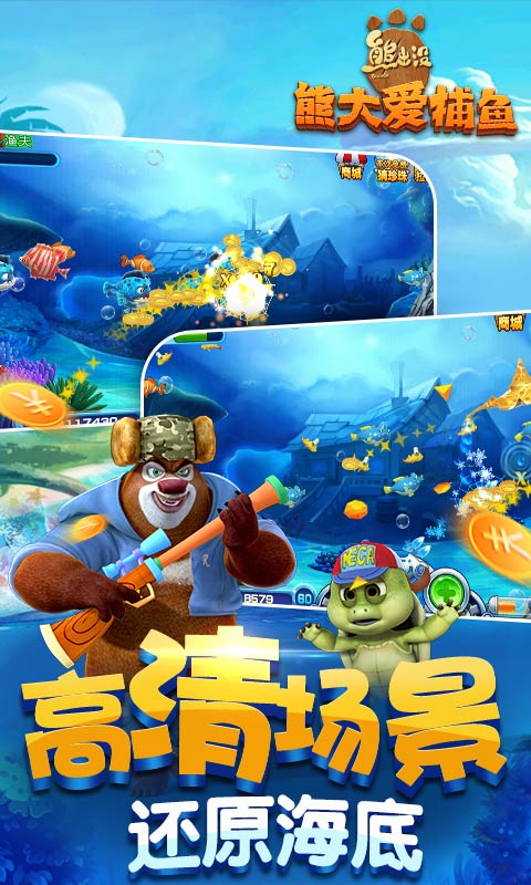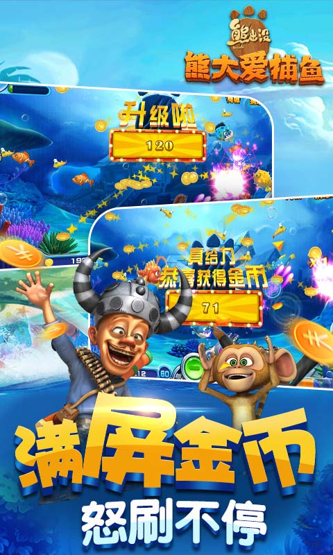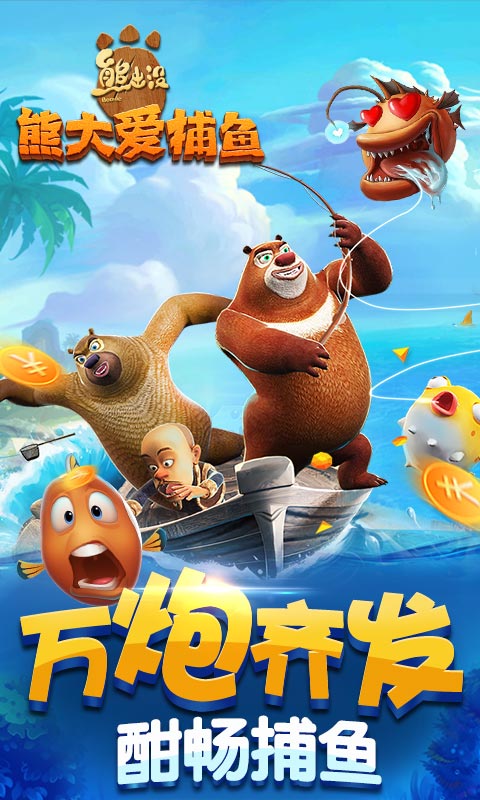 当当当当!新概念捕鱼休闲游戏《熊出没熊大爱捕鱼》华丽登场!国内首款“熊出没”主题捕鱼游戏,三大渔场震撼来袭,各种强力炮弹与技能种类丰富,让你瞬间万炮齐发,满屏金币爆不停,独创“一网打尽”玩法,更有超多神秘奖励,让你一夜暴富!