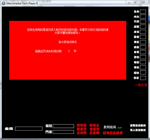 下载后和游戏放在同一目录下,然后把游戏名称改为 200612241516443988.swf (必须是英文名目录.如:d:\abc\),一定要按照这个方法来做,否则修改无法使用,如果下载的是打包好的游戏,修改器同样无法使用,一切准备好后,从修改器进入游戏修改器只能修改属性以及武学,不能修改当前的生命,所以没血了还是会死的,这意味着游戏开始的战斗一定要赢。