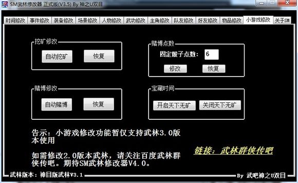 一、首先值得一提的是本次SM修改器终于支持武林2.0版本了!这也是我此次开始更新的一个原因之一。前几天突然想到了简化解决2.0和3.0的办法。于是着手开始尝试。并且实现了自动判断版本,哪怕你玩着2.0突然关掉换3.0(虽然原则上尽量不要这么蛋疼),也不用重开修改器之类。直接修改即可。