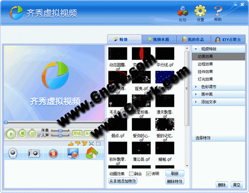 一款让你DIY视频效果的虚拟摄像头。它能够使你在软件上视频聊天时轻松设置视频的效果,让视频上的自己更动人。给视频画面加特效-让视频炫起来,给视频带魔法面具-让自己与众不同,海量的真实高仿真背景自由更换-从此不必劳烦布置身旁,共享音乐、电影和桌面-如同和朋友在家中一样的真实、自在。可在齐秀视频社区、QQ、MSN 、新浪UC等任何支持摄像头的软件和聊天室中使用。