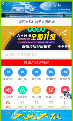 欢迎加入旅游去哪联盟平台。旅游、酒店、机票景点门票预订、团购等产品你想要的这里都有。诚邀您免费加盟代理。平台三级分销系统让您快速发展。0投入0风险高回报!圆您创业梦!微店商城邀您免费入驻。【软件特点】