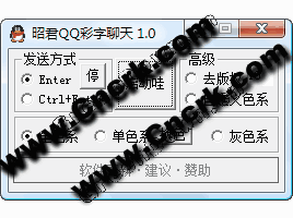 实现每发一条信息自动随机换文字颜色功能,让发出的文字多彩多姿,突显个性 与时尚。支持QQ2009和2010最新版本,可在多窗口切换,支持两种发送方式,QQ 群内也同样支持.有多种配色方式:全色系,单色系(可随机换色),灰色系。绿 色,安全,小巧,是您QQ聊天必备工具!使用方法:1,选发送方式,如果习惯Enter键发送,注意:请把QQ发送方式改成 Ctrl+Enter方式,如果习惯Ctrl+Enter发送,请把QQ发送方式改成Enter,正好相 反设置!2,选色系,3点击“”启动“”4打开QQ聊天窗口设置相应发送方式,5开始 个性聊天了!软件有两个高级功能,“”去版权“”是指去掉使用过程中随机加入的版权信息!“” 自定义色系“”是指可以自己选喜欢的色系,如果需要这两个功能可以赞助下作者 ,给予注册授权!以后软件更新,或者有问题都可以点软件下面的连接! 祝您使用愉快!如果觉得好请分享给你身边的朋友