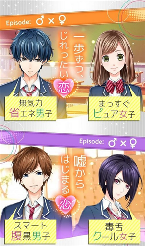 游戏内的配对有腹黑男子×无气力男子,腹黑男子×毒舌女子,无气力男子×纯情女子,毒舌女子×纯情女子……不同搭配的“初恋”,总有一款对你口味的!
