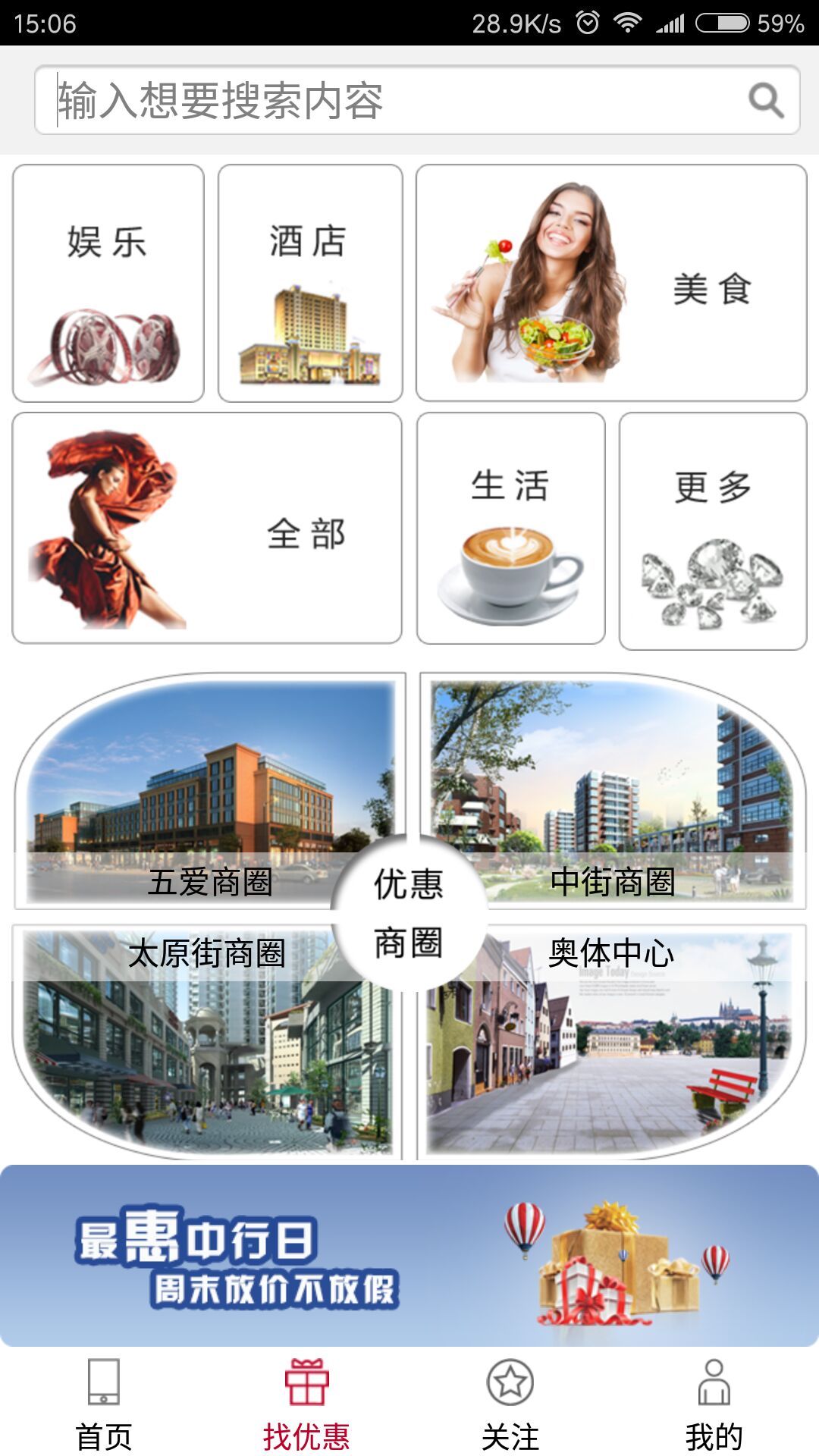 2,找优惠:实用的将优惠分类,便于用户查找,多重筛选条件,可以让用户在短时间找到想浏览的信息。