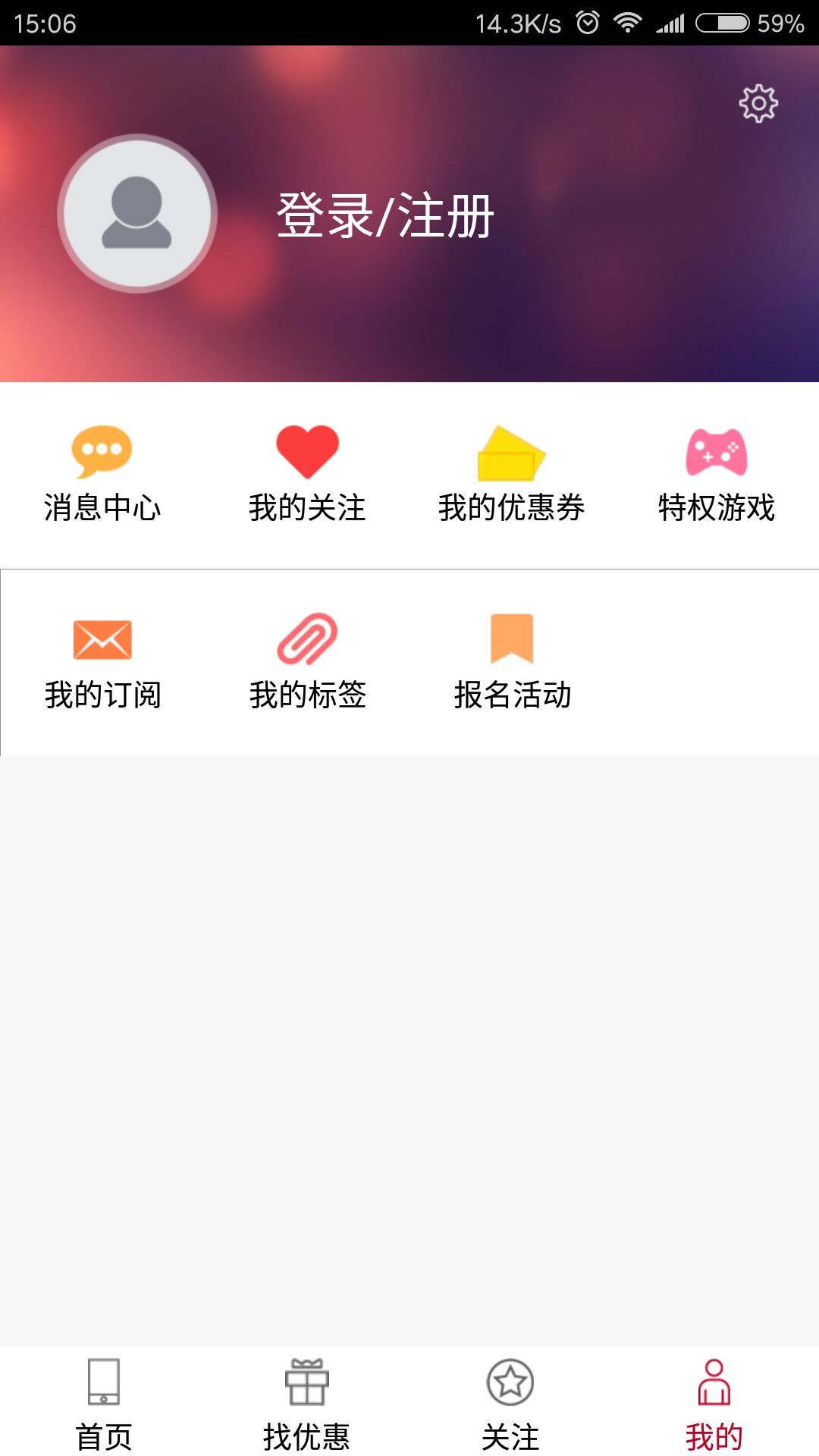 4,我的:消息中心,关注商家,我的优惠券,我的特权,我的订阅,我的标签,报名活动,各类便捷操作将丰富用户的生活。