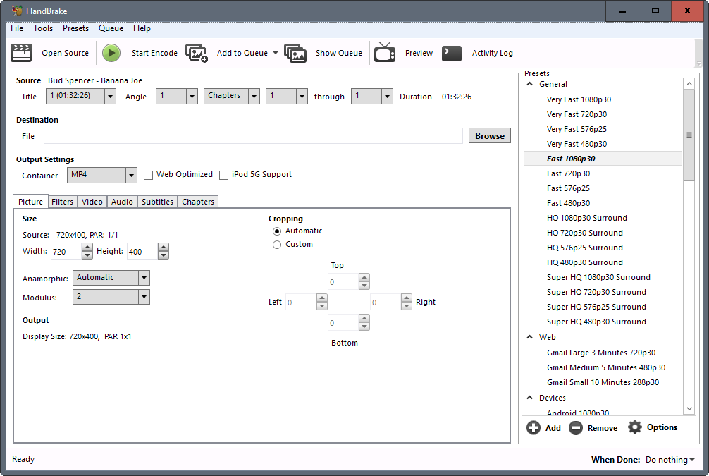 在2016年12月24日正式推出了1.0.0版本。该工具基本上允许没有版权保护的任意视频文件或者DVD/蓝光视频源转换成为mp4或者mkv格式。这款工具易于使用,同时也针对高级用户提供了丰富的转换控制选项。例如,用户可以在程序中加载1个或者多个视频文件,选择输出类型,例如Android 720p30, Playstation 1080p30 Surround或者Super HQ 1080p30等等,点击“开始编码”按钮就能执行转换工作。