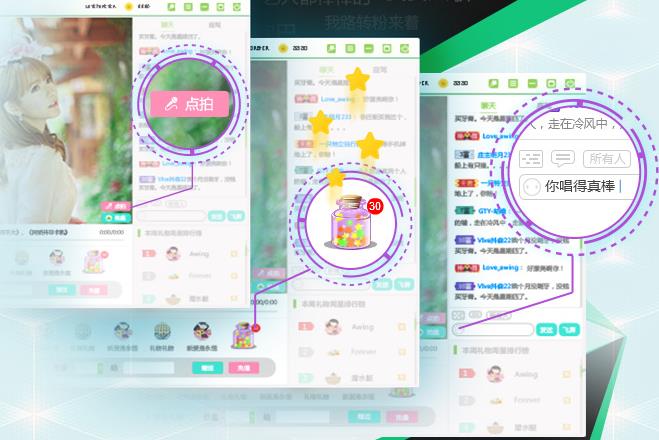 支持数万人同时在线参与互动,堪比小型演唱会;使用酷狗KRC精准歌词、伴奏曲库、点歌技术,把KTV搬到电脑屏幕前;首页高频自动刷新直播间列表,保证直播信息的即时性。