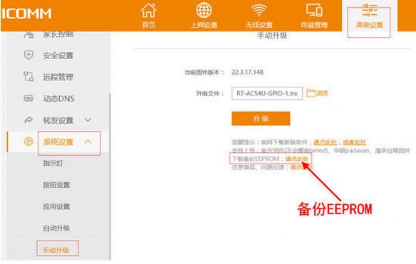 5、进入高级设置->系统设置->手动升级->点击此处备份EEPROM。