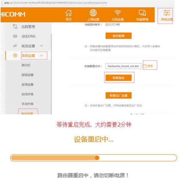 3、进入:高级设置->系统设置->备份恢复->浏览->选择下载的tianbaoha_breed_ssh.dat->点击恢复备份等待进度条完成(大约需要2分钟)。
